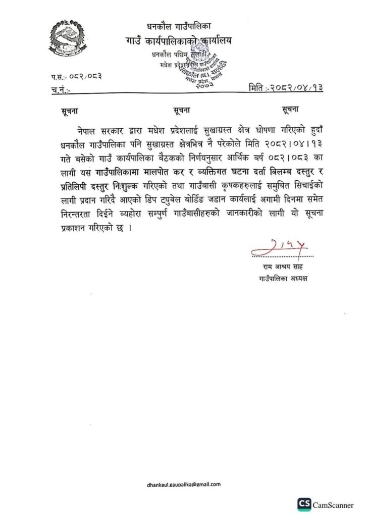 आर्थिक वर्ष २०८२/०८३ का लागि धनकौल गाउँपालिकाभित्रको मालपोत कर, व्यक्तिगत घटना दर्ताको विलम्ब दस्तुर र प्रतिलिपि दस्तुर पूर्ण रूपमा निःशुल्क गरिने भएको छ। यो निर्णयले लामो समयदेखि आर्थिक भार र प्रशासनिक झन्झट खेपिरहेका किसान तथा आम नागरिकलाई ठूलो राहत पुग्ने अपेक्षा गरिएको छ। अध्यक्ष साहले जारी गरेको विज्ञप्तिमा सुख्खाको चपेटामा परेका जनतालाई सहयोग पुर्‍याउन यो कदम चालिएको उल्लेख छ।
