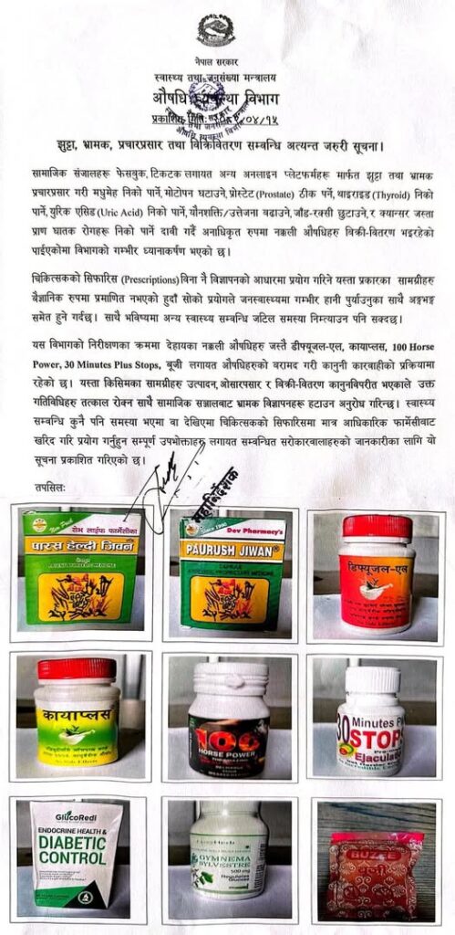 विभागले औषधिको नाम र तस्बिरसहितको अत्यन्त जरुरी सार्वजनिक सूचना जारी गर्दै ती उत्पादनहरू जनस्वास्थ्यका लागि जोखिमपूर्ण रहेको जनाएको छ । फेसबुक, टिकटक, युट्युब लगायत माध्यममा थाइराइड , प्रोस्टेट, सुगर, युरिक एसिड निर्को पार्ने, मोटोपन घटाउने, यौनशक्ति बढाउने, जाँड रक्सी छुटाउने र क्यान्सर जस्ता प्राण घातक रोग निको बनाउने भन्दै प्रचारप्रसार भइरहेको पाइएपछि विभागले विज्ञप्तिमार्फत यस्तो चेतावनी जारी गरेको हो ।