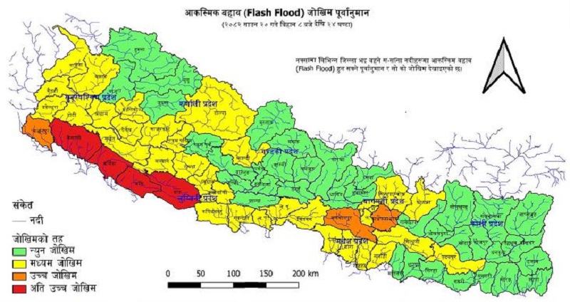 महाशाखाका अनुसार दाङ, बाँके, बर्दिया, कैलाली, कञ्चनपुर, काभ्रे र मकवानपुरमा बाढीको जोखिम उच्च छ ।