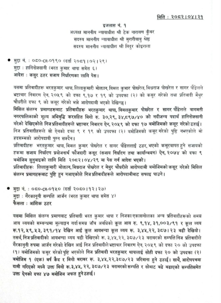 सर्लाही, २१ साउन। सर्लाहीको बागमती नगरपालिकाका निलम्बित मेयर भरतकुमार थापासहित ३ जना भ्रष्टाचार मुद्दामा दोषी ठहर भएका छन् । विशेष अदालतले निलम्बित मेयर थापासहित नगरका तत्कालीन प्रमुख प्रशासकीय अधिकृत विमलकुमार पोखरेल, योजना प्रमुख इन्जिनियर सागर पौडेललाई दोषी ठहर गरेको हो ।विशेष अदालतका अध्यक्ष न्यायाधीश टेकनारायण कुँवर र सदस्यद्वय मुरारीबाबु श्रेष्ठ र विदुर कोइरालाको इजलासले बुधबार भ्रष्टाचार मुद्दामा दोषी ठहर गरेको हो । उनीहरुको सजाय यही साउन २९ गते निर्धारण हुनेछ । उक्त कसुरमा ८ देखि १० वर्षसम्म कैद सजाय हुने कानुन अनुसार प्रावधान छ । अख्तियार दुरुपयोग अनुसन्धान आयोगले २०८१ जेठ २९ मा थापा, उपमेयर लीलाकुमारी मोक्तानसहित ६ जनालाई प्रतिवादी बनाएर ३० करोड २९ लाख ३४ हजार ८ सय ९७ रुपैयाँ बिगो मागदाबीसहित मुद्दा दायर गरेको थियो । नदीजन्य पदार्थको हानिनोक्सानी गरेको अभियोगमा उनीहरुलाई प्रतिवादी बनाइएको थियो । सोही मुद्दाको फैसला गर्दै थापासहित ३ जनालाई दोषी ठहर गरेको हो भने अरु ३ जना उपमेयर लीलाकुमारी मोक्तान, तत्कालीन लेखा अधिकृत विश्वराज पोखरेल र जिल्ला समन्वय समिति सर्लाहीका तत्कालीन प्रमुख मेथुर चौधरीलाई भने सफाइ दिएको छ ।