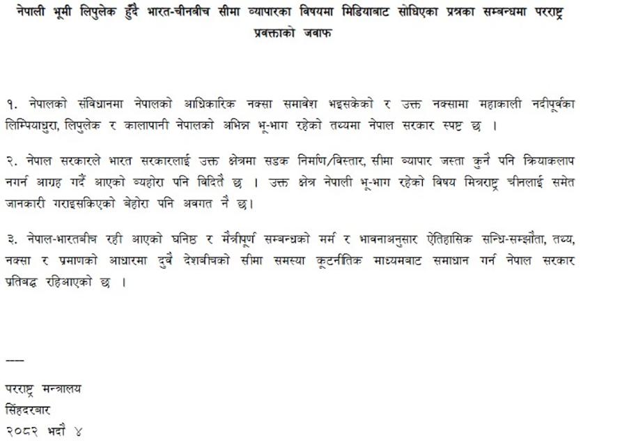 मन्त्रालयले जारी गरेको ३ बुँदे विज्ञप्तिमा भनिएको छ, ‘नेपालको संविधानमा नेपालको आधिकारिक नक्सा समावेश भइसकेको र उक्त नक्सामा महाकाली नदीपूर्वका लिम्पियाधुरा, लिपुलेक र कालापानी नेपालको अभिन्न भूभाग रहेको तथ्यमा नेपाल सरकार स्पष्ट छ ।’