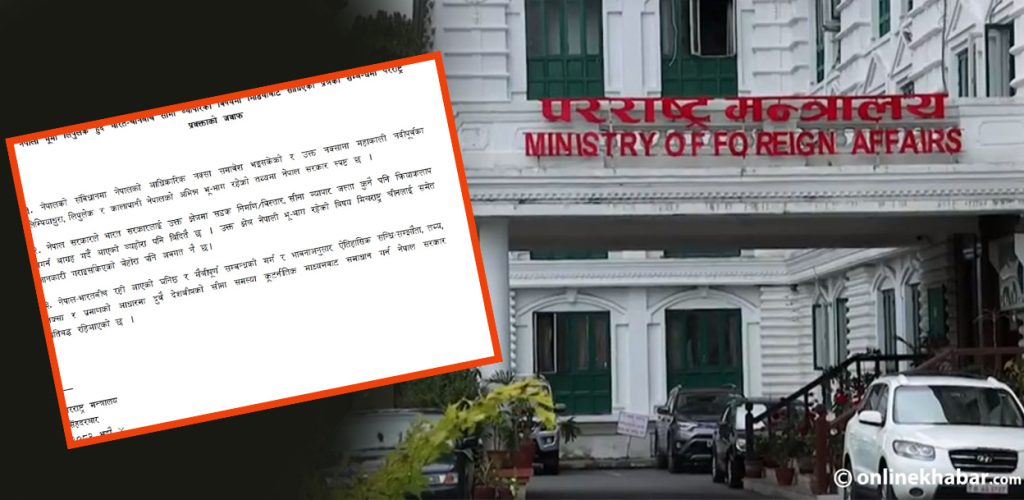 यसैगरी नेपाल कूटनीतिक माध्यमबाट उक्त मुद्दामा समाधान खोज्न तयार रहेको परराष्ट्रले भनेको छ । ‘नेपाल-भारतबीच रही आएको घनिष्ठ र मैत्रीपूर्ण सम्बन्धको मर्म र भावनाअनुसार ऐतिहासिक सन्धि-सम्झौता, तथ्य, नक्सा र प्रमाणको आधारमा दुवै देशबीचको सीमा समस्या कूटनीतिक माध्यमबाट समाधान गर्न नेपाल सरकार प्रतिबद्ध रहिआएको छ,’ वक्तव्यमा उल्लेख गरेको छ ।
