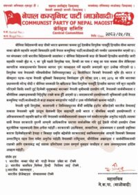 सर्लाही, ०५ भदाै । नेपाल कम्युनिष्ट पार्टी (माओवादी) ले हालै चीन र भारतबीच लिपुलेक पासमार्फत सीमा व्यापार पुनः सुरु गर्ने सहमति प्रति कडा आपत्ति जनाउँदै उक्त निर्णय नेपालमाथिको हस्तक्षेप र सार्वभौमिकताको उल्लंघन भएको बताएको छ ।