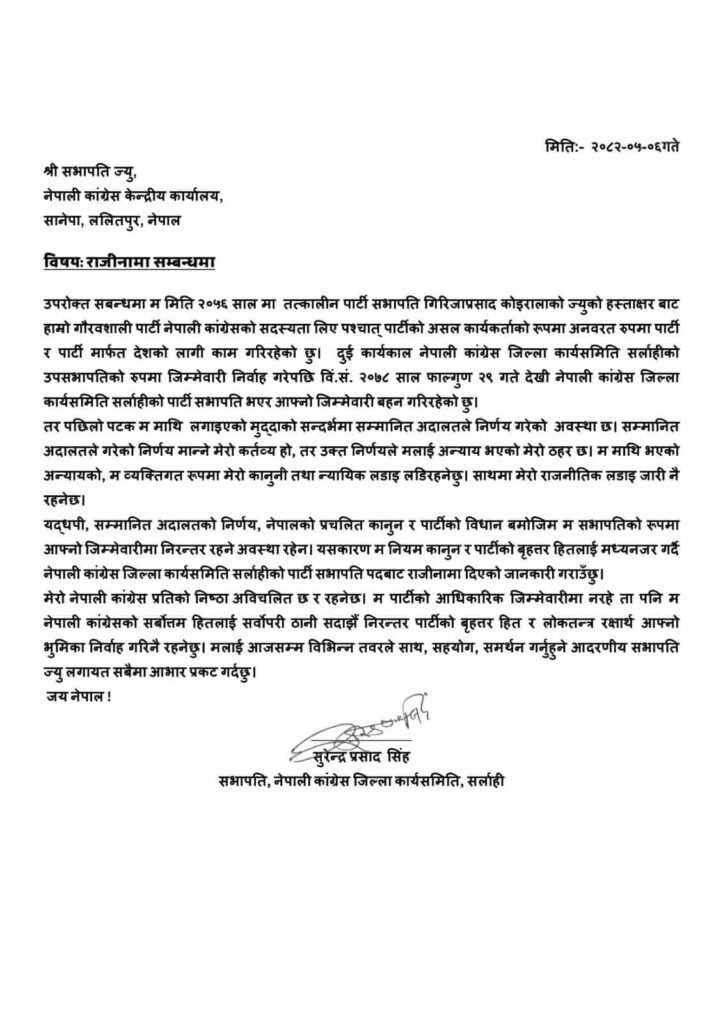 २०५६ सालमा तत्कालीन पार्टी सभापति गिरिजाप्रसाद कोइरालाको हस्ताक्षरबाट पार्टी सदस्यता लिएपछि निरन्तर पार्टी र मुलुकको सेवामा सक्रिय रहेर काम गर्दै आएका सिंहले दुई कार्यकाल उपसभापति र २०७८ साल फाल्गुण २९ गतेदेखि जिल्ला सभापतिको जिम्मेवारी बहन गर्दै आएका थिए । तर हालै आफ्ना विरुद्ध दायर भएको मुद्दामा सम्मानित अदालतले गरेको निर्णयपछि सभापतिको पदमा निरन्तर रहने अवस्था नरहेको भन्दै उनले पदबाट राजीनामा दिएका हुन् ।