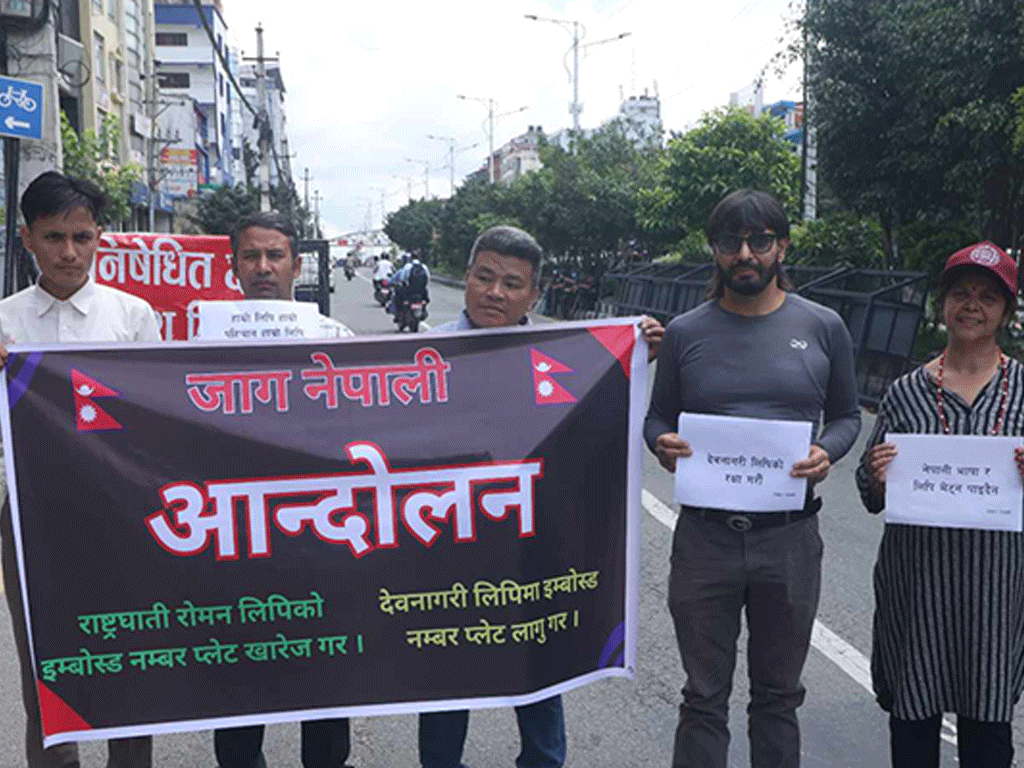 सर्लाही, ११ भदाै । रोमन लिपिको इम्बोस्ड नम्बर प्लेट खारेजीको माग गरेर काठमाडौँमा प्रदर्शन भएको छ। ‘जाग नेपाली’ समूहले रोमन लिपिको इम्बोस्ड नम्बर प्लेटलाई राष्ट्रघातीको संज्ञा दिएको छ ।