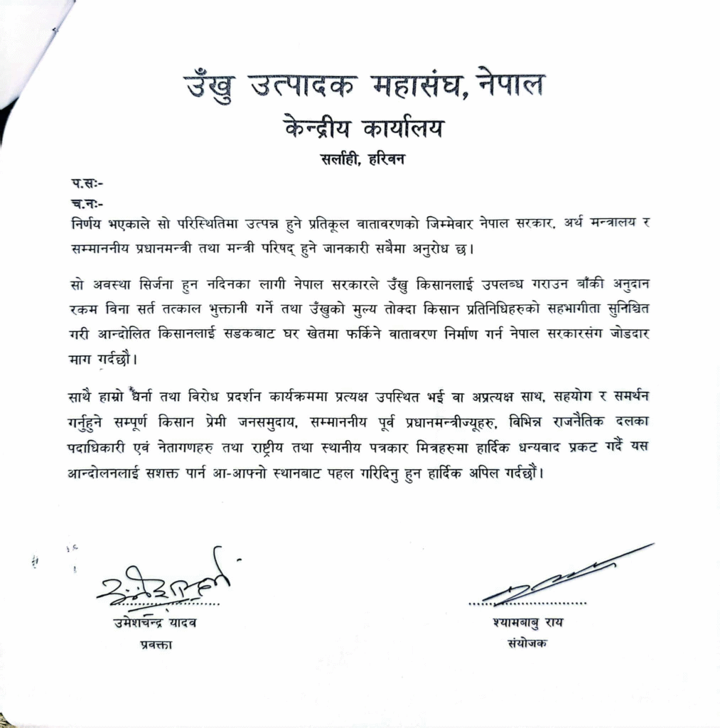 सो अवस्था सिर्जना हुन नदिनका लागि सरकारले उखु किसानलाई उपलब्ध गराउन बाँकी अनुदान रकम विना सर्त तत्काल भुक्तानी गर्ने तथा उखुको मूल्य तोक्दा किसान प्रतिनिधिहरूको सहभागिता सुनिश्चित गरी आन्दोलित किसानलाई सडकबाट घर खेतमा फर्किने वातावरण निर्माण गर्न नेपाल सरकारसँग माग गरेका छन् ।