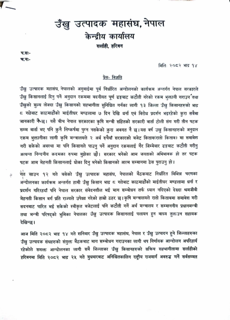 उखु उत्पादक महासंघ, नेपाल र उखु उत्पादन हुने जिल्लाहरूका संघको शनिबार बसेको संयुक्त बैठकले यही भदौ २५ गतेदेखि राजमार्ग अवरुद्ध पारेर आन्दोलन गर्न निर्णय गरेको हो ।