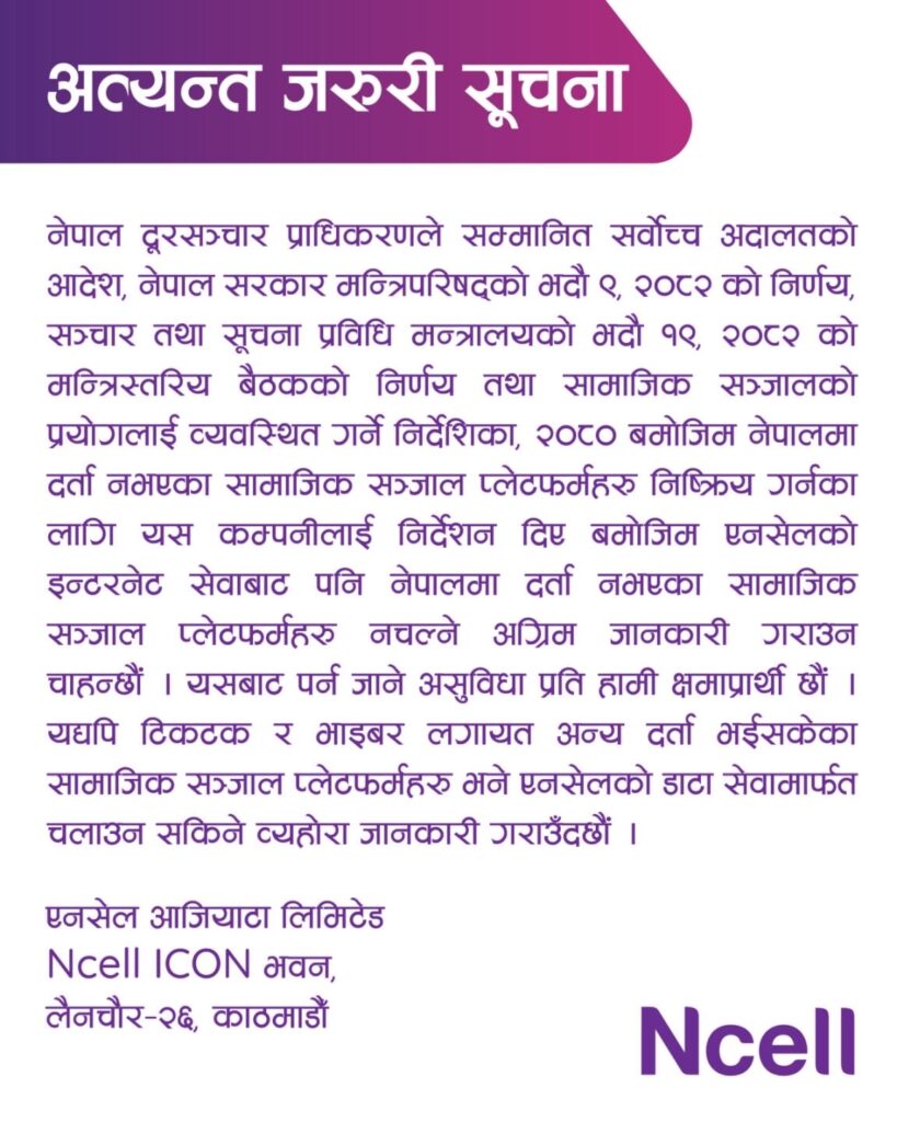 सर्लाही, २० भदाै । मोबाइल र इन्टरनेट सेवा प्रदायक कम्पनी एनसेलले आफ्नो मोबाइल डाटाबाट सरकारले रोक लगाएका सामाजिक सञ्जालहरू नचल्ने जानकारी गराएको छ ।