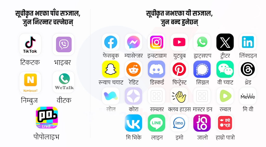 सर्लाही, २० भदाै । सरकारले सूचीकरण नभएका सामाजिक सञ्जालहरू आजैदेखि बन्द गर्ने निर्णय गरेको छ । यो निर्णयसँगै अब कुन–कुन सामाजिक सञ्जाल नेपालमा चलाउन सकिन्छ भन्ने विषयमा चौतर्फी चासो बढेको छ ।