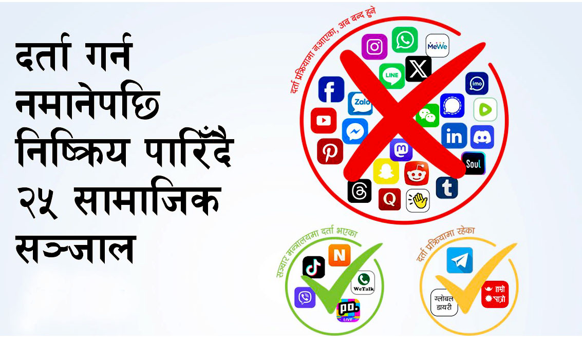 तर, फेसबुक, म्यासेञ्जर, युट्युबलगायतका सामाजिक सञ्जाल–प्लेटफर्म दर्ता हुन मानेनन्। सरकारले दिएको समय बुधबारसम्मको थियो। ‘अन्तिम पटक’ को आग्रह पनि बेवास्ता गरेको भन्दै सञ्चार मन्त्रालयमा बसेको मन्त्रीस्तरीय निर्णयले सूचीकरण नभएका फेसबुक, एक्स, ह्वाटसएपसहितका सामाजिक सञ्जाल बन्द गर्ने निर्णय गरेको हो। सञ्चारमन्त्री एवं सरकारका प्रवक्ता पृथ्वीसुब्बा गुरुङले फेसबुक, एक्सलगायतका सामाजिक सञ्जाल सूचीकरणका लागि अन्तिम समयवधि तोकेर आह्वान गर्दा पनि दर्ताका लागि नआएपछि बन्द गर्नु अवस्थामामा पुगेको