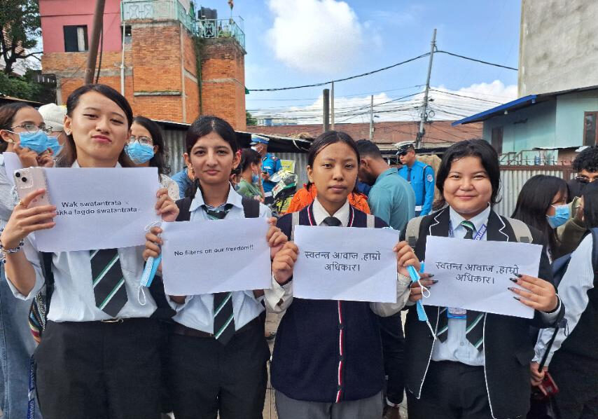 ‘असन्तुष्टि चरम छ, नेताको गोजी गरम छ’, ‘जेनजी चिच्याउँछ, भ्रष्टहरूलाई गिज्याउँछ’, ‘कता हिँडेको ट्याक्स लुटेर ?’, ‘स्वतन्त्र आवाज हाम्रो अधिकार’, स्टप करप्सन (भ्रष्टाचार रोक) लगायतका नारा लेखेका प्लेकार्ड बोकेर उनीहरूले प्रदर्शन गरिरहेका छन् ।