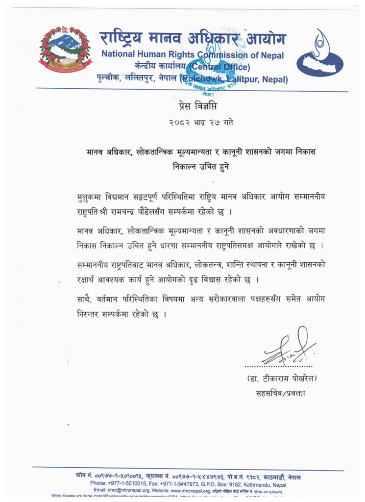 ‘मुलुकमा विद्यमान सङ्कटपूर्ण परिस्थितिमा राष्ट्रिय मानव अधिकार आयोग राष्ट्रपति रामचन्द्र पौडेलसँग सम्पर्कमा रहेको छ’ आयोगले विज्ञप्तिमा भनेको छ, ‘मानव अधिकार, लोकतान्त्रिक मूल्यमान्यता र कानूनी शासनको अवधारणाको जगमा निकास निकाल्न उचित हुने धारणा राष्ट्रपतिसमक्ष आयोगले राखेको छ ।’