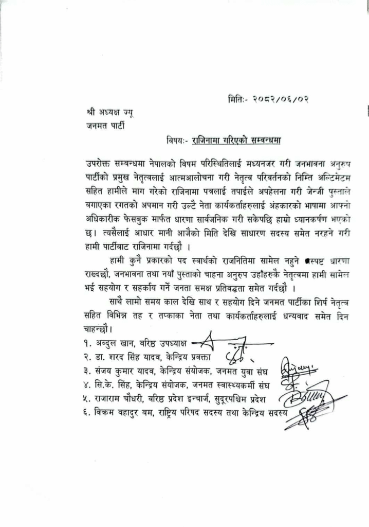 उपाध्यक्ष अब्दुल खान, प्रवक्ता डा. शरदसिं यादव, युवा संघका केन्द्रीय संयोजक सीके सिंह, सुदूरपश्चिम इञ्चार्ज राजाराम चौधरी र राष्ट्रिय परिषद सदस्य विक्रमबहादुर बमले पार्टी छाडेका हुन् ।