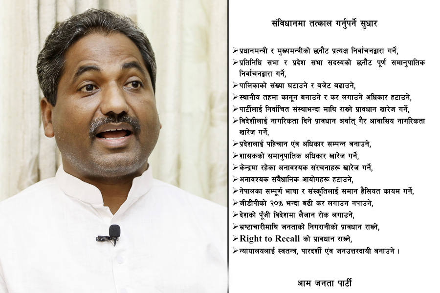 ‘प्रधानमन्त्री र मुख्यमन्त्रीको छनोट प्रत्यक्ष निर्वाचनद्वारा गर्नुपर्ने, प्रतिनिधिसभा र प्रदेशसभा सदस्यको छनोट पूर्ण समानुपातिक निर्वाचन प्रणाली अनुसार हुनुपर्ने, पालिकाको संख्या घटाउने र बजेट बढाउने’ आजपाको प्रस्ताव छ ।