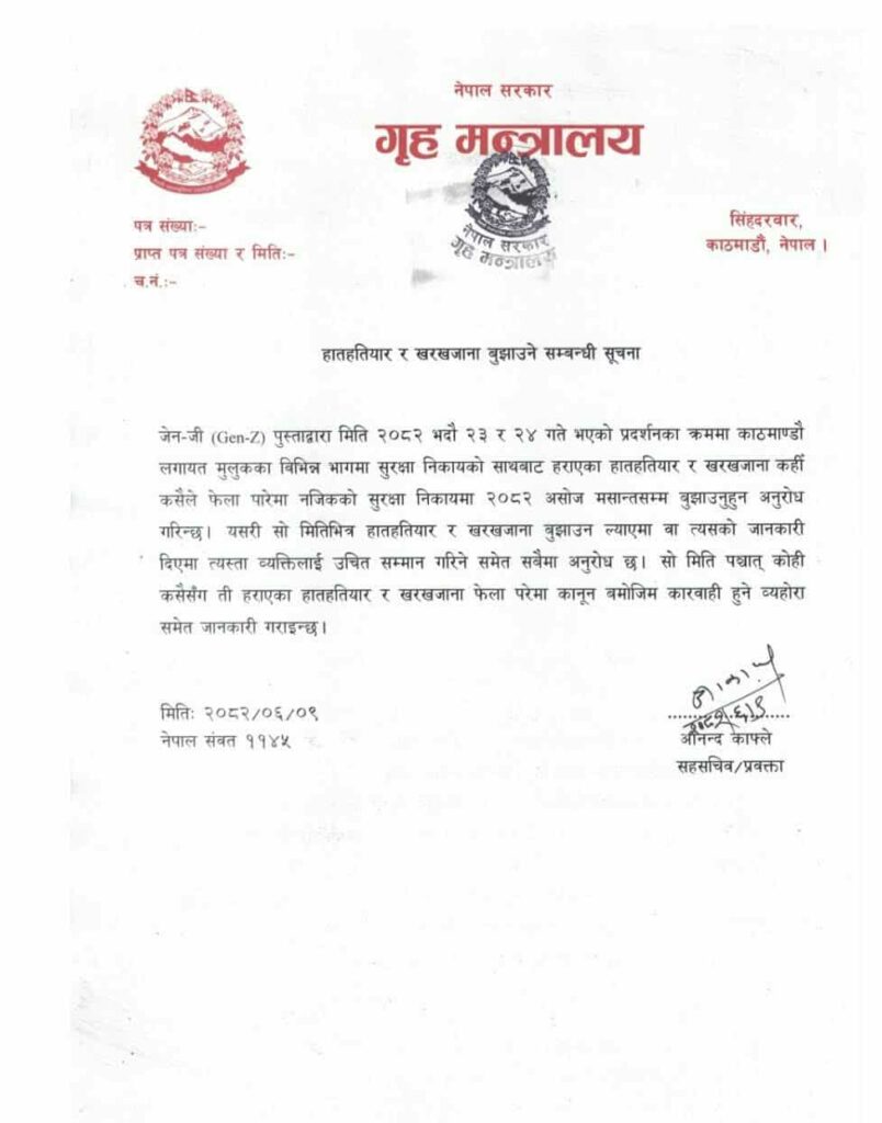 गृह मन्त्रालयले सूचना जारी गरी विभिन्न ठाउँमा रहेका सुरक्षा निकायबाट हराएको हातहतियार र खरखजाना कही कसैले फेला पारेको भए नजिकको सुरक्षा निकायमा फिर्ता गर्न आग्रह गरेको हो ।