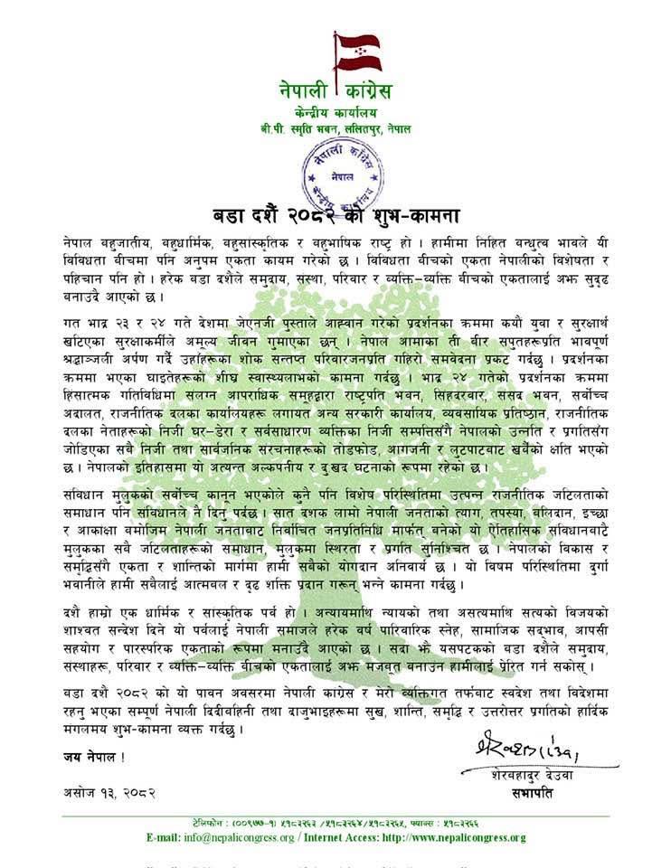 सोमबार बडादशैंको उपलक्ष्यमा शुभकामना सन्देश जारी गर्दै उनले बडादशैंले समुदाय, संस्था, परिवार र व्यक्तिव्यक्ति बीचको एकतालाई अझै मजबुत बनाउन सहयोग पुग्ने अपेक्षा व्यक्त गरेका छन् ।