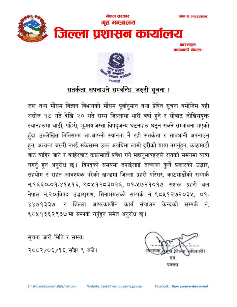 जिल्लामा भारी वर्षा हुने र यसबाट जोखिमयुक्त ठाउँहरुमा बाढी, पहिरो, भू–क्षय जस्ता विपद्जन्य घटनाहरु घट्न सक्ने सम्भावना रहेको भन्दै अत्यन्त जरुरी नभई सकेसम्म लामो दुरीको यात्रा नगर्न, काठमाण्डौबाट बाहिर जाने र प्रवेश गर्नेहरुले रातको समयमा यात्रा नगर्न आग्रह गरेको छ ।