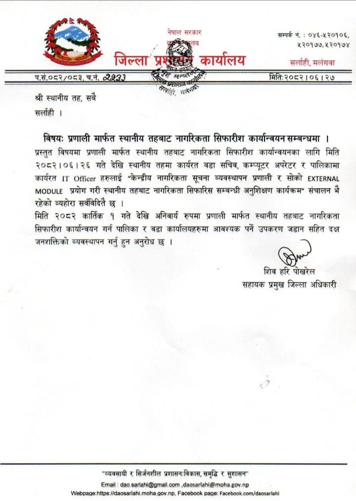 उहाँले भन्नुभयो अनलाइनबाट नागरिकताको सिफारिसको व्यवस्था मिलाउनका लागी २० वटै स्थानीय तहका आईटी अफिसर, वडामा कार्यरत सचिव र कम्प्यूटर अपरेटरहरुलाई जिल्ला प्रशासन कार्यालय सर्लाहीको आयोजना तालिम प्रदान गरिएको छ ।