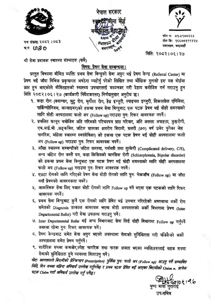 बोर्डका उपसचिव पुण्यमाया गुरागाईंले एक पटक प्रथम सेवा विन्दुबाट रिफर गरिसकेको बिरामीलाई पुनः रिफर आवश्यक नभएको र सबै सेवा प्रदायक स्वास्थ्य संस्थाहरूलाई यसबारेमा पत्राचार गरिसकेको विज्ञप्तिमार्फत जानकारी गराउनुभएको छ ।