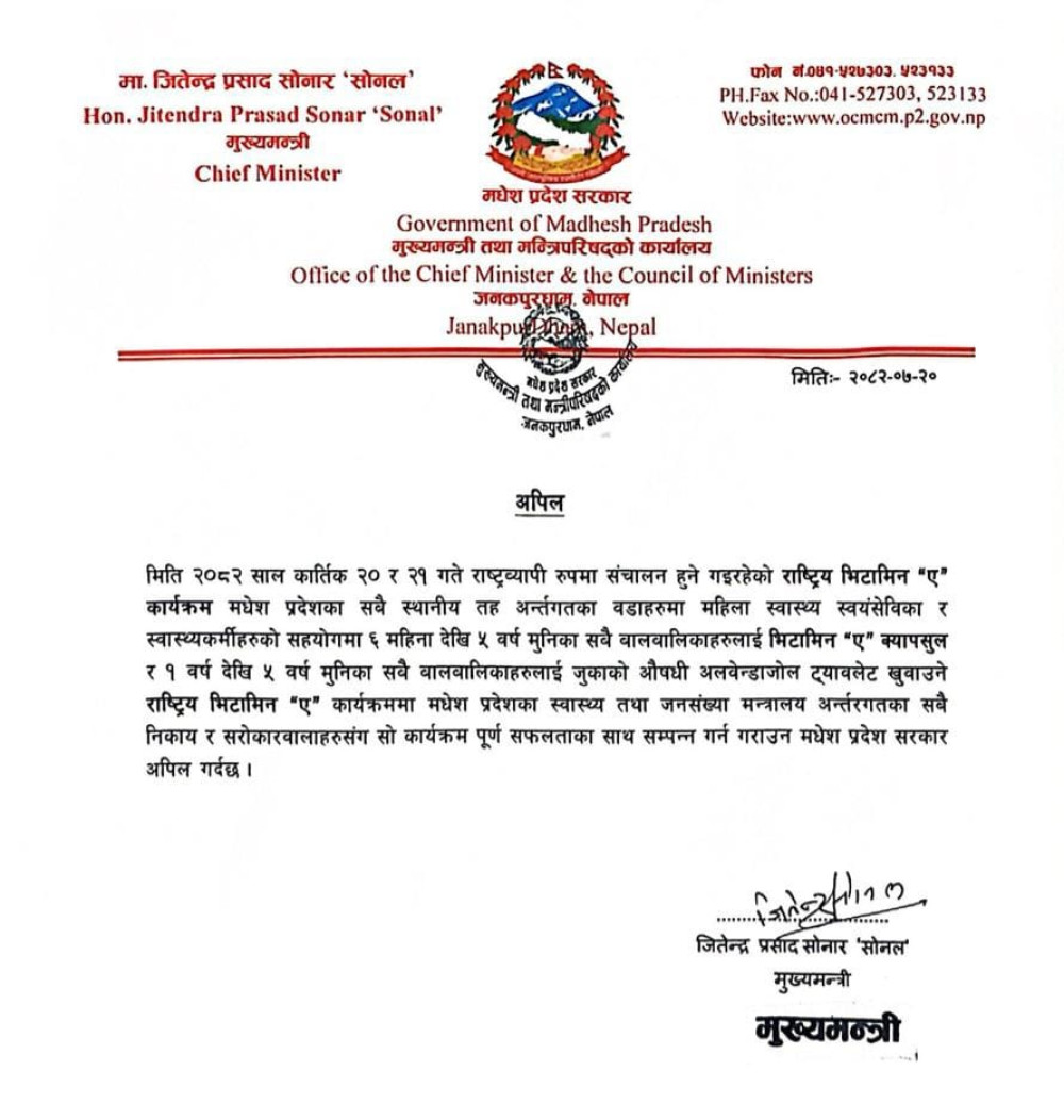 मधेश प्रदेशको एक सय ३६ वटा स्थानीय तहको सम्पुर्ण वडामा आजदेखि जारी दुई दिवसीय भिटामिन ए र जुकाको औषधी खुवाउने कार्यमा सहयोग गर्न मधेशका स्वास्थ्य तथा जनसंख्या मन्त्रालय अन्तर्गतका सम्पुर्ण कर्मचारी लगायत सरोकारवालाहरुमा मुख्यमन्त्री सोनलले एक सन्देश जारी गर्दै अपिल गर्नुभएको हो ।