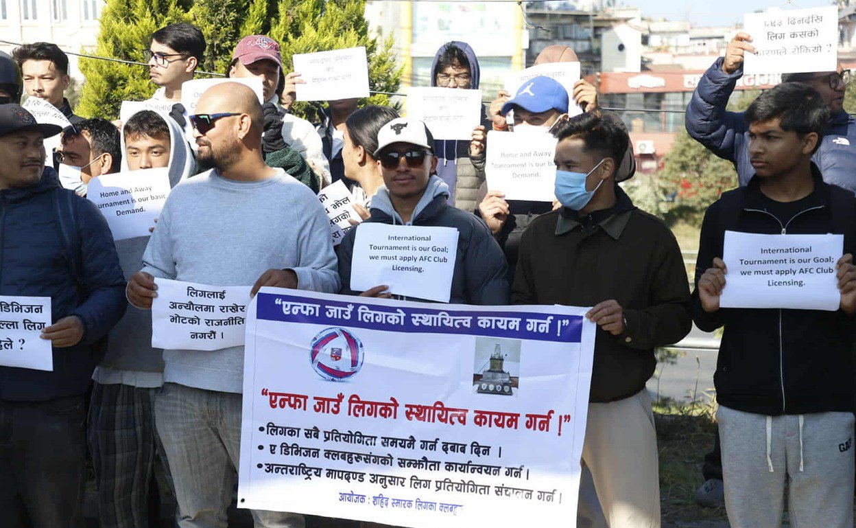 यसअघि नेपाल फुटबल खेलाडी संघले सातदोबाटोस्थित एन्फा कम्प्लेक्स गेटमा धर्ना दिएको थियो । संघले पनि ए डिभिजन लिग तुरुन्त सुरु गर्न माग गर्दै घरेलु फुटबल नियमित गर्नुपर्ने आवाज उठाएको थियो ।