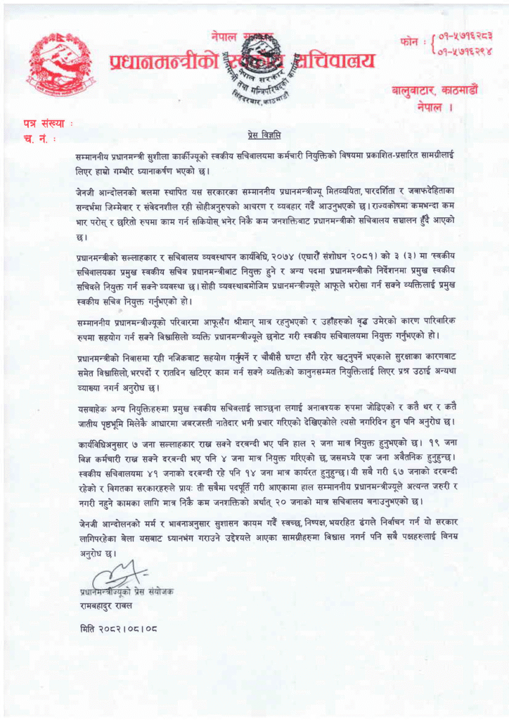 चौतर्फी आचोचनापछि प्रधानमन्त्री कार्कीका प्रेस संयोजक रामबहादुर रावलले सोमबार बिहान जारी गरेको विज्ञप्तिमा लेखिएको छ, ‘प्रधानमन्त्रीको निवासमा रही नजिकबाट सहयोग गर्नुपर्ने र चौबीसै घण्टा पनि सँगै रहेर खट्नुपर्ने भएकाले सुरक्षाका कारणबाट समेत विश्वासिलो, भरपर्दो र रातदिन खटिएर काम गर्न सक्ने व्यक्तिको कानुनसम्मत नियुक्तिलाई लिएर प्रश्न उठाई अन्यथा व्याख्या नगर्न अनुरोध छ ।’