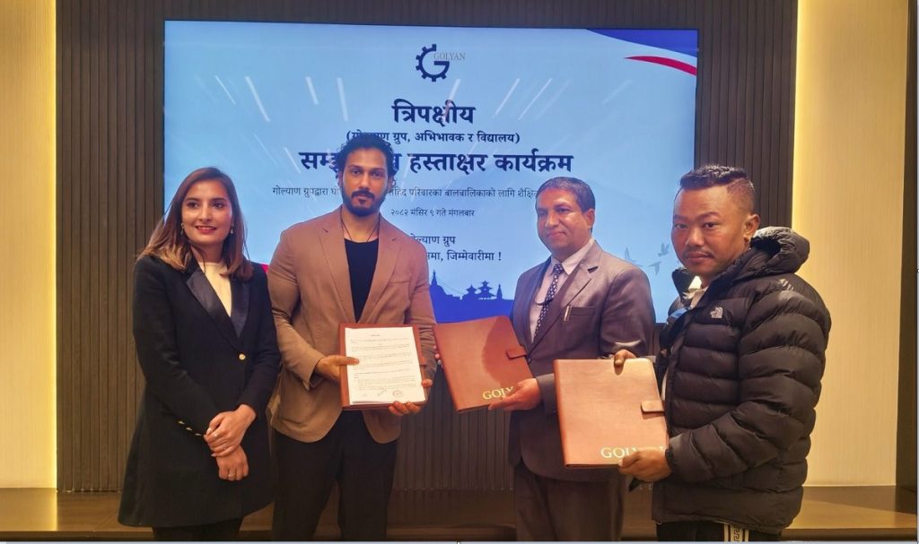 शहीद परिवारका बालबालिकालाई अध्ययनको लागि गोल्यान ग्रुप, विद्यालय र अभिभावकबीच गोल्यान टावरमा मंगलबार त्रिपक्षीय सम्झौता भएको हो ।