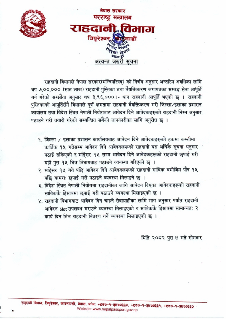 गएको मङ्सिर १५ गतेपछि आवेदन दिने आवेदकहरूको राहदानी यही पुस १५ गतेपछि क्रमशः छपाइ गरि पठाइने व्यवस्था मिलाइने विभागको भनाइ छ । विदेशमा रहेको नेपाली नियोगमा राहदानीका निम्ति आवेदन दिएका आवेदकहरूको पासपोर्ट साविककै हिसाबमा छपाइ गरि पठाउने व्यवस्था मिलाइएको छ ।