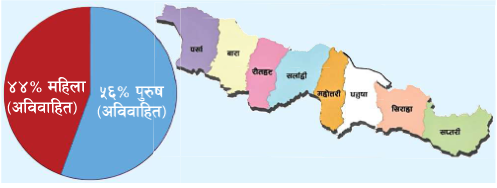 तीमध्ये १६ लाख २८ हजार पुरुष (५६ प्रतिशत) र १३ लाख ११ हजार महिला (४४ प्रतिशत) अविवाहित रहेको तथ्यांक छ । यसले पुरुष–महिलाबीचको अन्तर बढ्दै गएको देखाउँछ ।