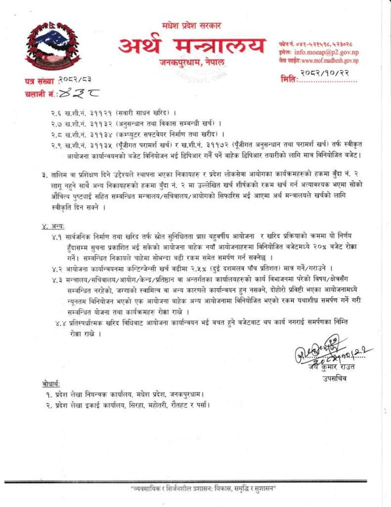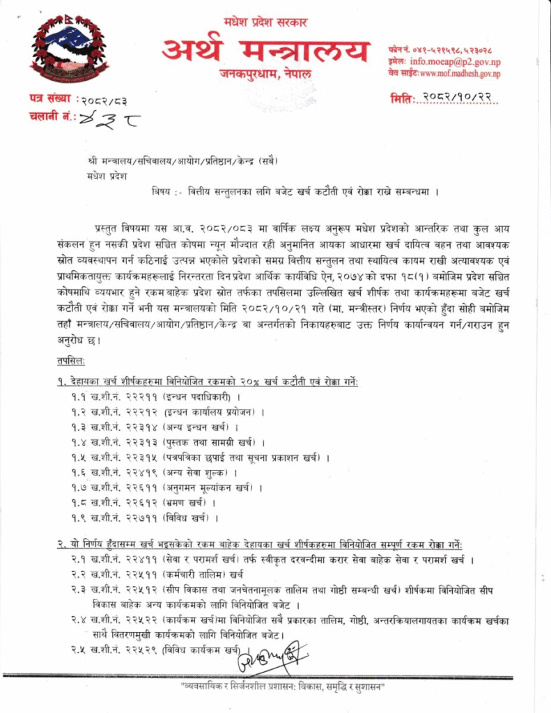 अर्थ मन्त्रालयद्वारा जारी परिपत्रअनुसार सवारी साधन खरिद, फर्निचर, सजावट, महँगा कार्यालय सामग्री, अनावश्यक गोष्ठी, सेमिनार, भ्रमण तथा आतिथ्य खर्चमा कडाइका साथ रोक लगाइएको छ ।