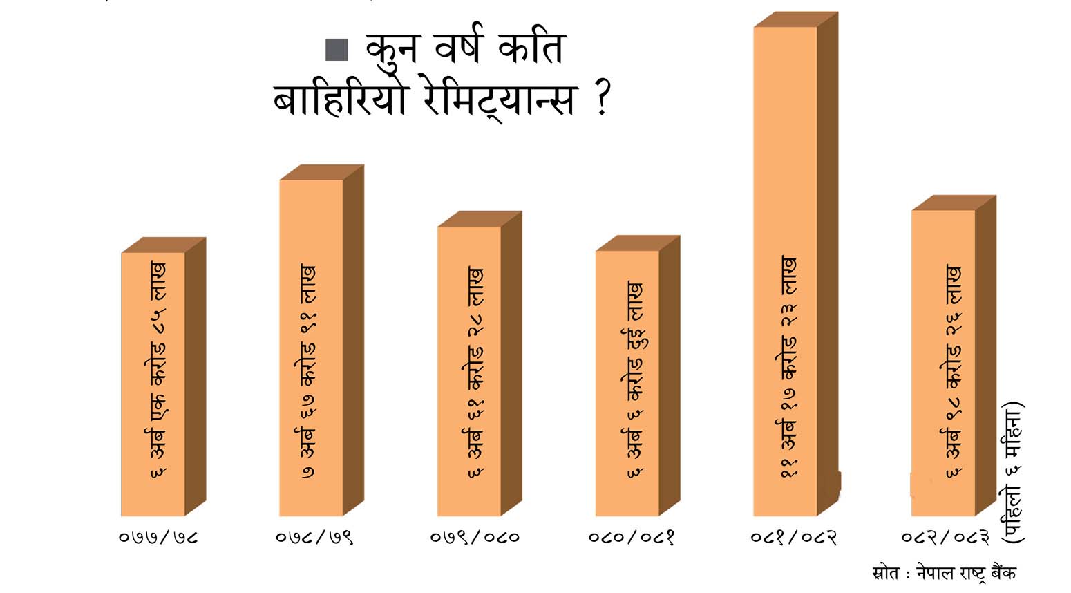 गत आवमा बाहिरिएको रेमिट्यान्स हालसम्मकै उच्च हो । चालू आवको ६ महिनामा भने ६ अर्ब ९८ करोड २६ लाख रुपैयाँ रेमिट्यान्स बाहिरिएको छ ।