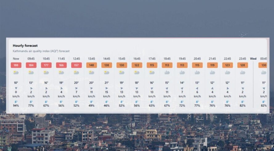 रियल टाइममा मापन गर्ने स्विट्जरल्याण्डको आईक्यू एयरका अनुसार आज बिहान (समाचार तयार पार्दासम्म) काठमाडौंको वायु गुणस्तर इन्डेक्स (एक्यूआई) १७१ छ । जबकि १५० नाघ्नुलाई नै अस्वस्थ मानिन्छ ।