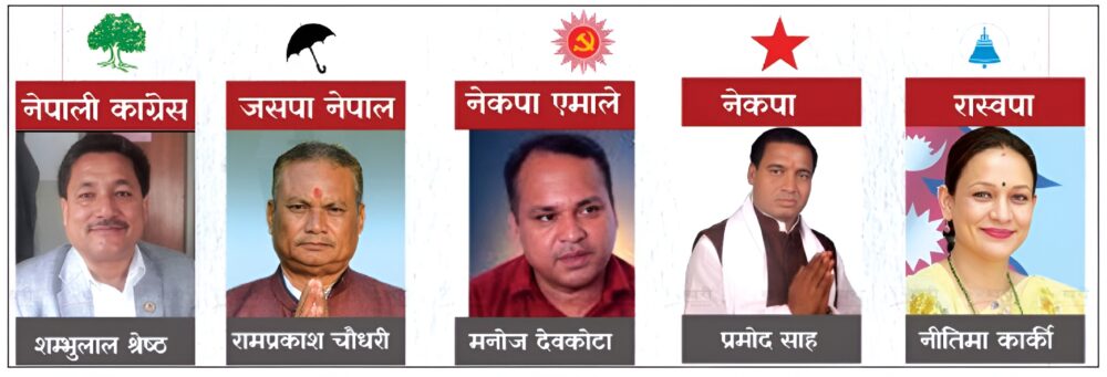 उमेदवारी दिएकामध्ये शम्भुलाल, प्रमोद र रामप्रकाश यस क्षेत्रका पूर्वप्रतिनिधिसभा सदस्य भइसकेका उम्मेदवार हुन् । यसले प्रतिस्पर्धालाई थप चासोको विषय बनाएको छ । एमालेका मनोज र रास्वपाका नितिमा नयाँ उम्मेदवार हुन् ।