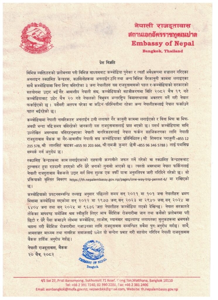 दूतावासका अनुसार कम्बोडियामा नेपाली नागरिकलाई अनलाइन ठगीलगायत गैरकानुनी काममा लगाइएको तथा बिना भिसा वा भिसा अवधि नाघेर बसिरहेको जानकारी प्राप्त भएको छ। यस्तो अवस्थामा रहेका नेपालीलाई नेपाल फर्कन सहजीकरणको लागि नेपाली राजदूतावास बैंकक वा गैरआवासीय नेपाली संघ कम्बोडियाका प्रतिनिधिसँग यथाशीघ्र सम्पर्क गर्न अनुरोध गरिएको छ।