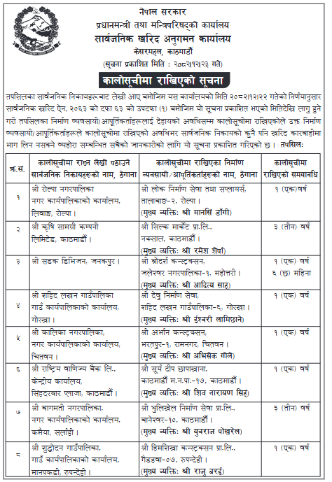 कार्यालयले सोमबार एक सूचना जारी गर्दै आठ वटा निर्माण कम्पनी तथा आपूर्तिकर्ताको विवरण सार्वजनिक गरेको हो ।