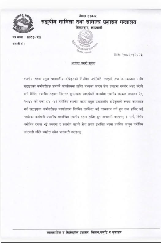 मन्त्रालयले स्थानीय तहमा सेवा प्रवाह प्रभावकारी बनाउन कर्मचारीको नियमित उपस्थिति सुनिश्चित गर्न यस्तो निर्देशन जारी गरेको जनाएको छ ।