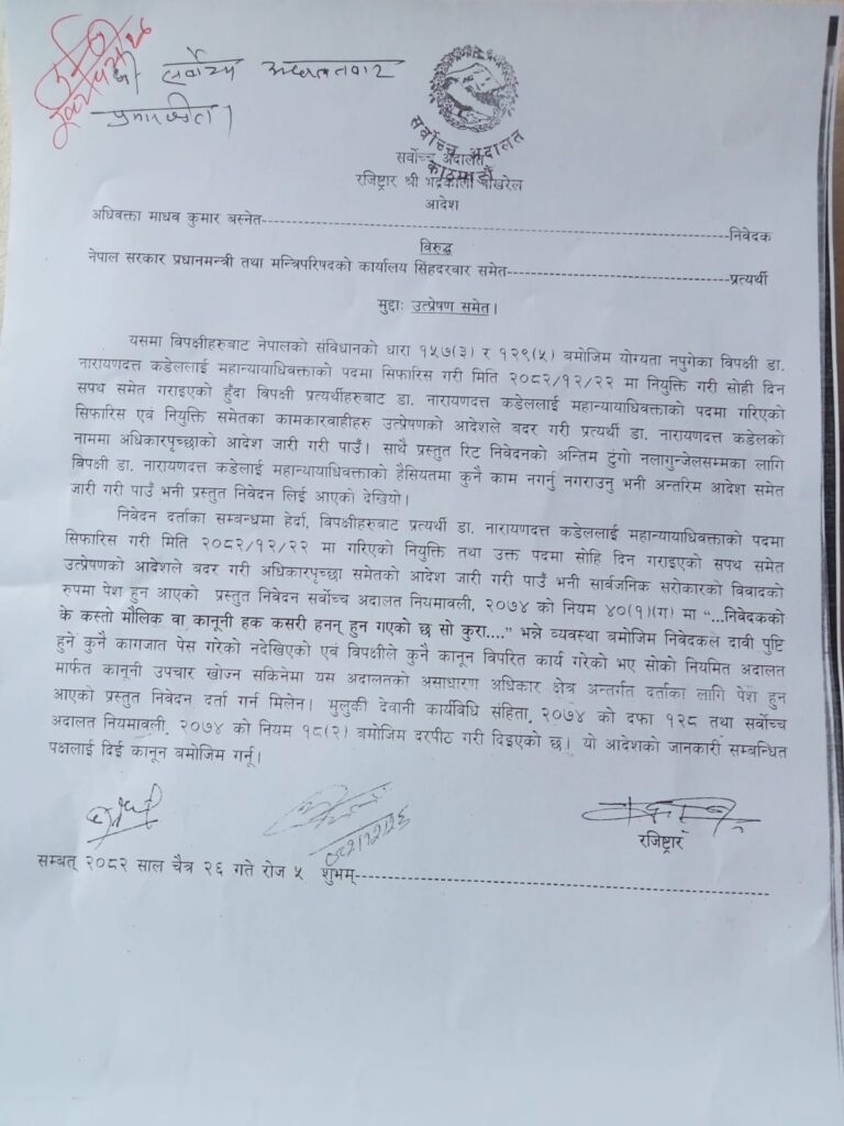 प्रधानमन्त्री बालेन्द्र शाह (बालेन)ले कडेललाई यही चैत २२ गते महान्यायाधिवक्तामा नियुक्त गरेका थिए । रिटमा कडेलको संवैधानिक योग्यतामाथि प्रश्न उठाइएको छ ।