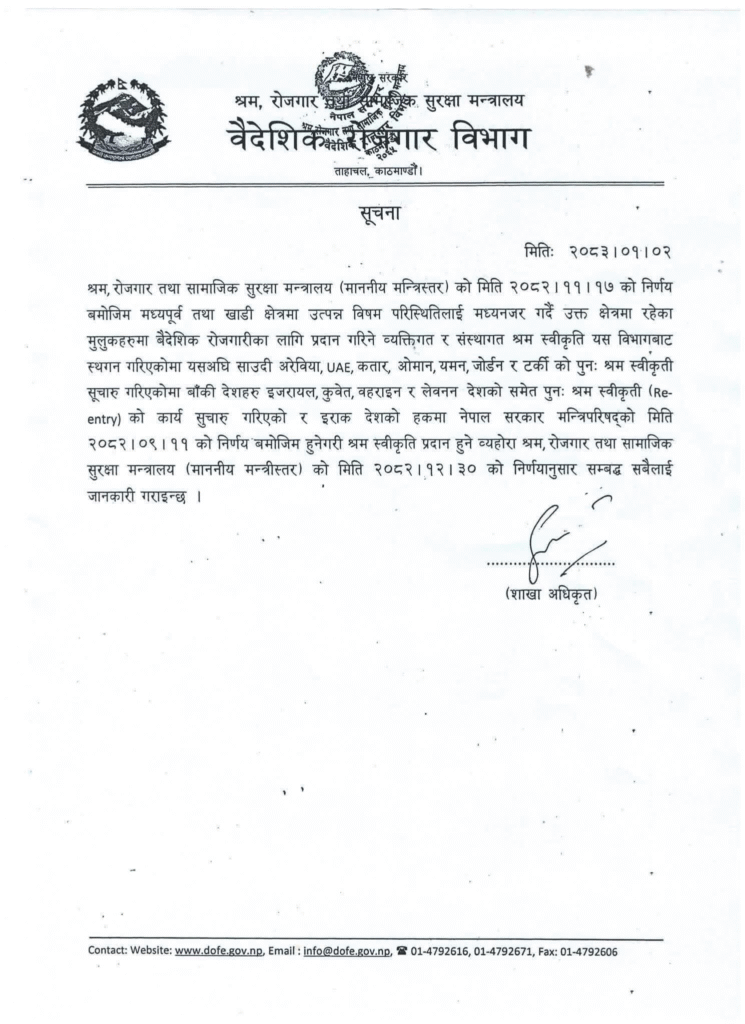 यस्तै नेपालीको अर्को श्रम गन्तव्य देश इराकको हकमा भने नेपाल सरकार मन्त्रिपरिषदको २०८२ पुस ११ गतेको निर्णय वमोजिम श्रम स्वीकृति प्रदान हुने पनि विभागले जनाएको छ ।