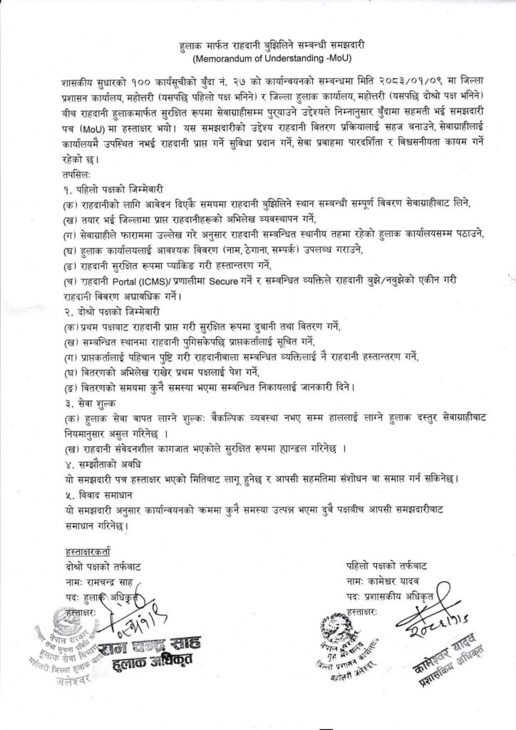 साथै, सेवा प्रभावकारी कार्यान्वयनका लागि सम्बन्धित निकायबिच समन्वयलाई थप मजबुत बनाइने उद्देश्य सहित जिल्ला प्रशासन कार्यालय महोत्तरी को तर्फबाट प्रशासकीय अधिकृत कामेश्वर यादव र जिल्ला हुलाक महोत्तरीको तर्फबाट हुलाक अधिकृत रामचन्द्र साहले समझारीपत्रमा हस्ताक्षर गरेर राहदानी सम्बन्धी काम अघि बढाएको छ ।